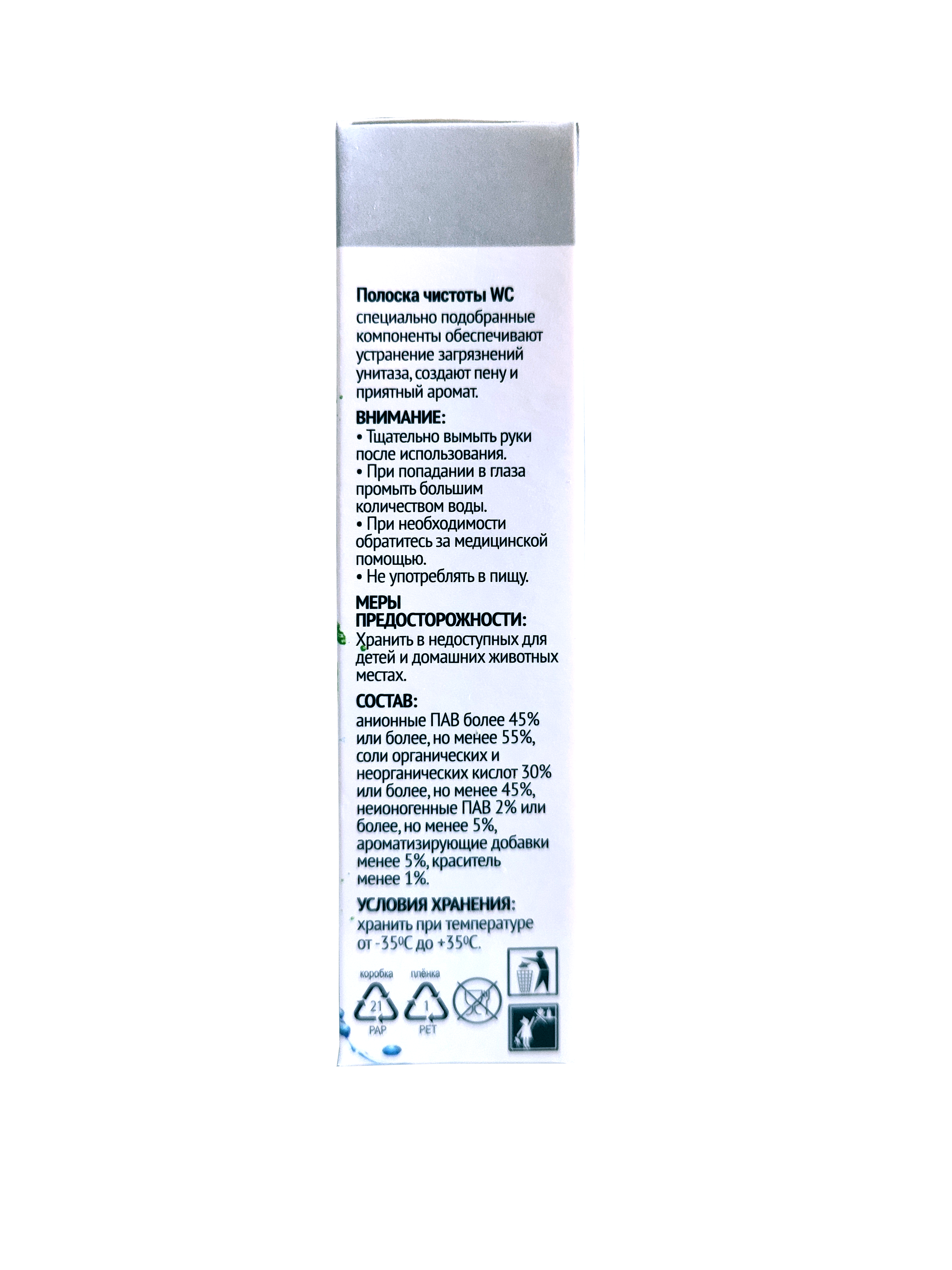 Одновременно моющее и освежающее средство для унитаза длительного действия. Благодаря равномерному смыванию, полоски чистоты препятствуют отложению известкового налета, водного и мочевого камня, уничтожают бактерии. Распространяют приятный аромат и пену. Выпускается в трех ароматах: лес, лимон, море.